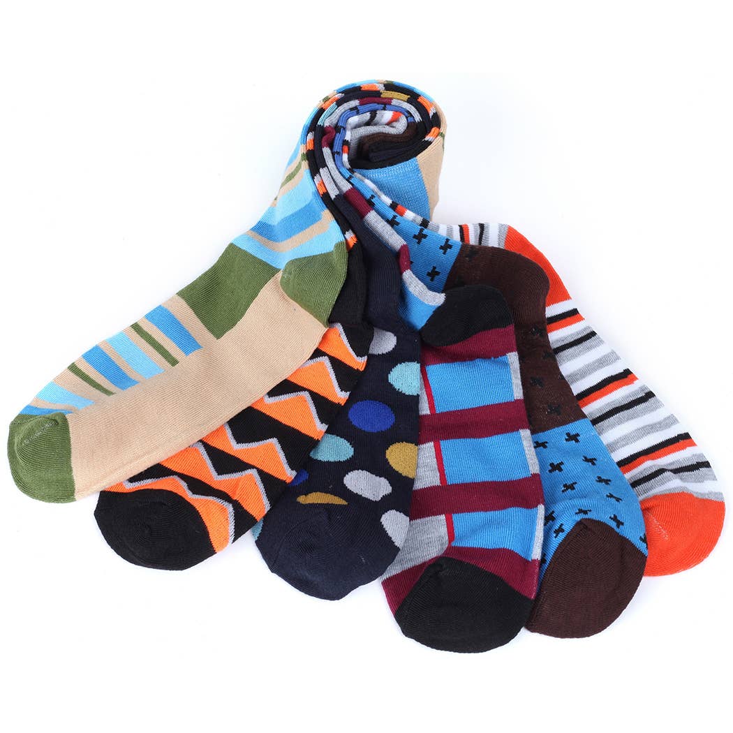 6 Pair of casual dress socks. 94% polyester and 6% spandex for better fit. Fun, hip and colorful pattern designs to compliment your style. Made with water repelling fibers that preserve its color and shape. Machine washable. Each set comes securely packed in a reusable gift worthy box.